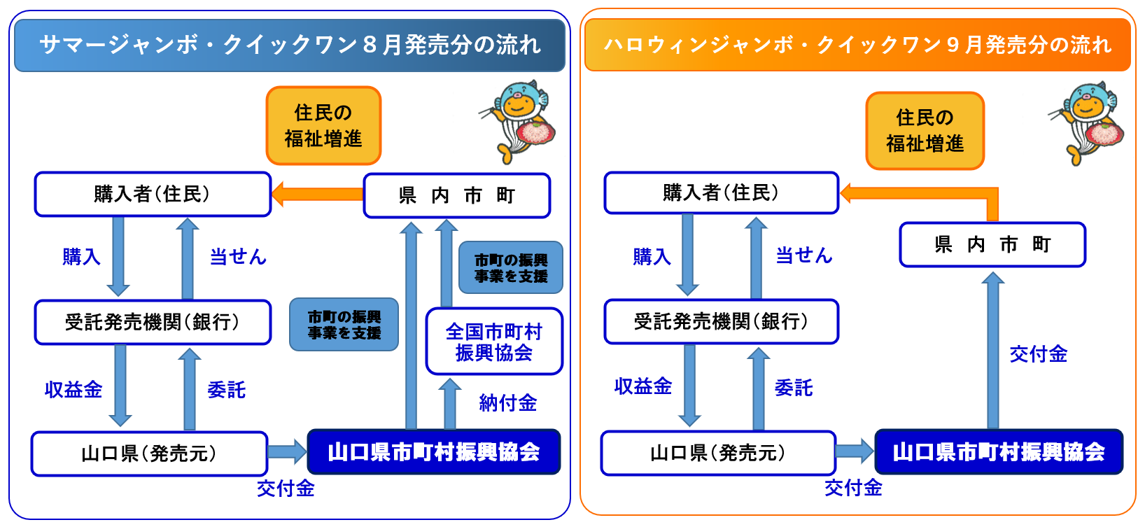 1年を通して発売されるクイックワンのうち、8月発売回号分の収益金はサマージャンボ(市町村振興宝くじ)と同様に、9月発売回号分の収益金はハロウィンジャンボ(新市町村振興宝くじ)と同様に取り扱われます。